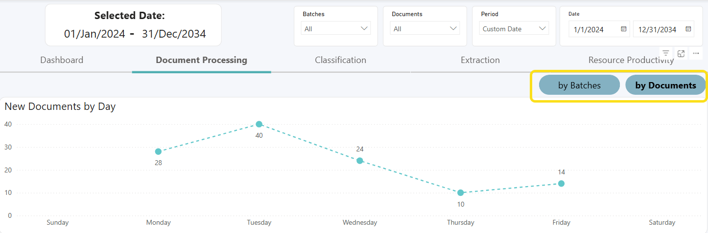 You can easily switch the view per chart by selecting by Batches or by Documents buttons, shown below.