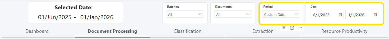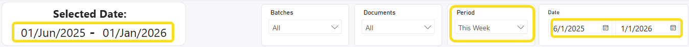 If you use the Period field to select a period or the Date fields to select a custom range, the Selected Date and the Date fields are updated accordingly, as shown below.