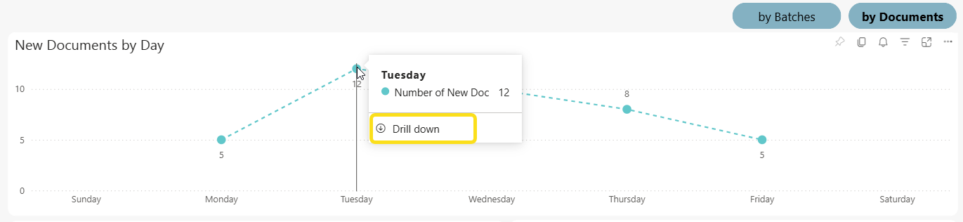 This chart provides a detailed breakdown of either new batches or new documents processed per day. Click a number in the chart to highlight the related data on the other two charts on the screen. When in the New Documents by Day view, you can hover your cursor over an entry to view drill-down information. While hovering, wait until the Drill-down option appears, and then click to view details about the specific dates that the documents were created.