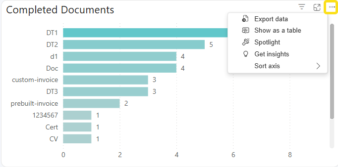 Export data: Provides options to export the data in the chart to a specified file format (.xlsx or .csv). Depending on the chart content, you may only be able to export summarized data. Data with the current layout is only available if you select this option for a table or matrix.
