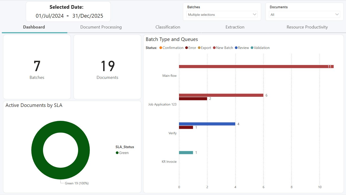 Last Updated: Version R2601The main dashboard provides overview information only. At a glance, you can view the number of batches, number of document, and active document by SLA (displayed as a percentage).
