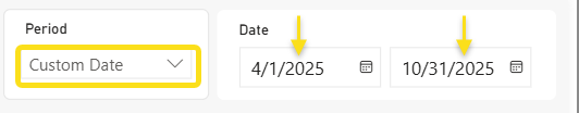 If you choose Custom Date, you need to use the Data selection option to choose a start and end date. These fields are only available when Custom Date is selected in the Period list.