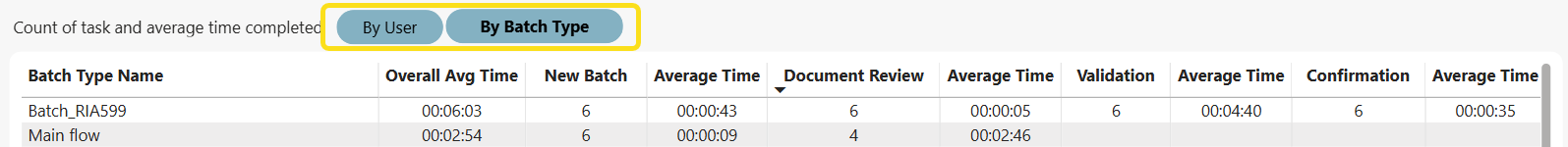 Use the chart located at the bottom of the screen to view the number of tasks completed vs. the average time spent on each task to identify possible improvements. You can filter the chart based on user or batch type. You can then sort columns based on ascending or descending values. As you click on specific rows in the table, the charts above update to reflect your selections.