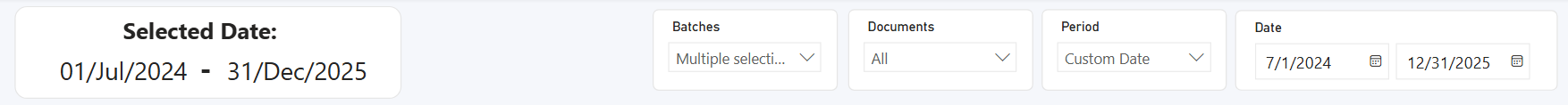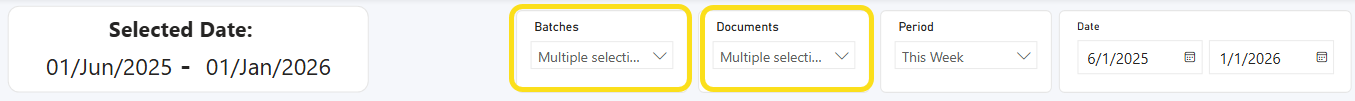 Criteria used to create these dashboards are based on batch and document data. From each list, select one or more Batch types, and one or more Documents. The charts are updated automatically after any new selection. By default, filters are applied for All batches and All documents.