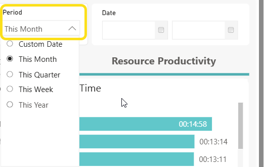 There are five individual charts and one table provided on the Resource Productivity tab. As you click on entries in the chart, the table below will update to filter data. Each chart is described below.