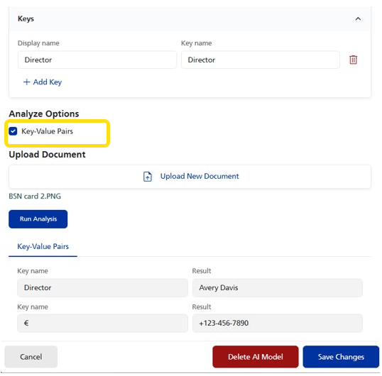 When configuring an AI Model for Optical Character Recognition, you can enable the Key-Value Pairs option to upload a sample document to RICOH IA for analysis. The analysis, RICOH IA returns a list of all key-value-pairs extracted by the AI model. You can then create a field and map keys to those fields.