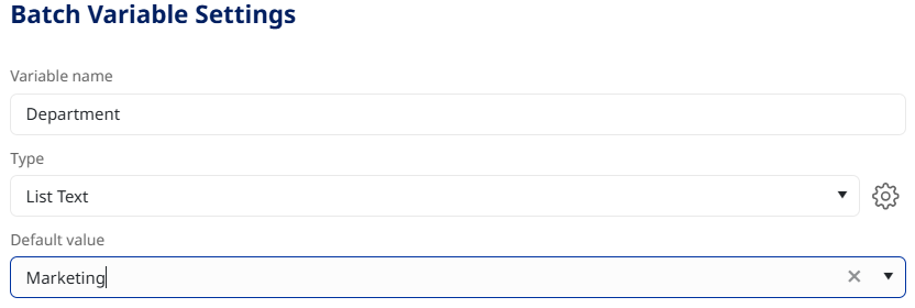 User Defined Variables: Define a custom variable. Enter a variable name, choose the type and then enter the default value for this variable. For example, if you want the Operator to pick from a list of Departments, you can create a "department" variable, and then set the Type to List Text. Click the gear symbol to add department names to the list. Select one of the department names as the Default value.