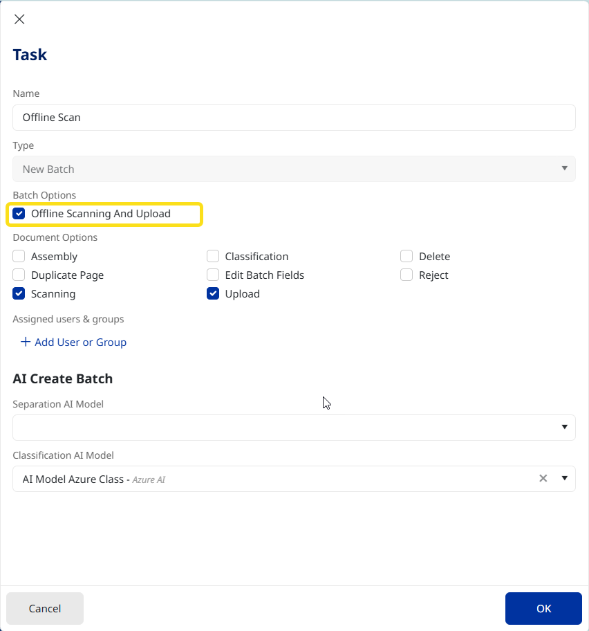 Last Updated: Version R2510The Offline Upload Agent supports high-volume document scanning with near real-time review capabilities. Documents are processed locally on the operator’s workstation, significantly reducing the delay before scanned images are displayed. Users can scan documents, and they are automatically separated according to defined profiles. Supported separation methods include manual selection, page count, barcode detection and patch code recognition.