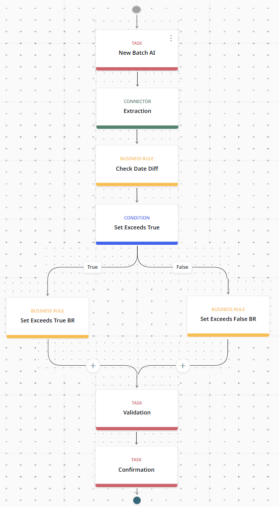 Last Updated: Version R2510The customer wants to scan invoices and determine if the invoice date exceeded 90 days from the current date. The process flow required connecting to an AI model to identify the invoice date field, and then applied a business rule to perform the date check. Conditions were created to handle the document differently if the current date exceeds or is within the 90 day period.