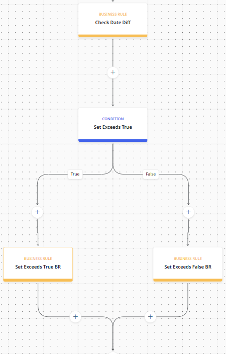 In the example flow shown below, a combination of business rules and a condition determine the document handling. The first business rule calculate the date differential, and then the condition stop the process to branch if true or false. The branched business rules handle the document differently based on the result of the initial date calculation.