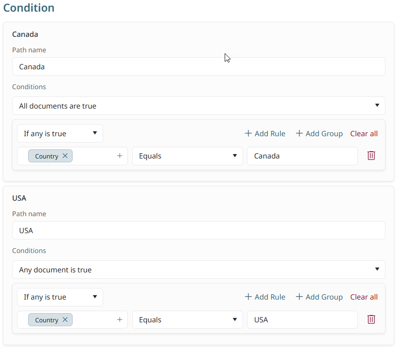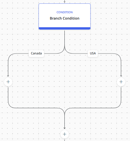 Alternatively, a condition could require a branch of the process flow into two unique paths that are based on document information rather than a true/false condition. For example, if dealing with invoices from two countries and you need to route the invoices based on the country of origin, you could create a condition that branches the documents when a variable is identified. In this example, Path 1 will route invoices from Canadian companies, whereas Path 2 will route invoices from USA companies. Because the document routing requires two different locations, a condition easily splits the flow based on the country name that is found within the document.