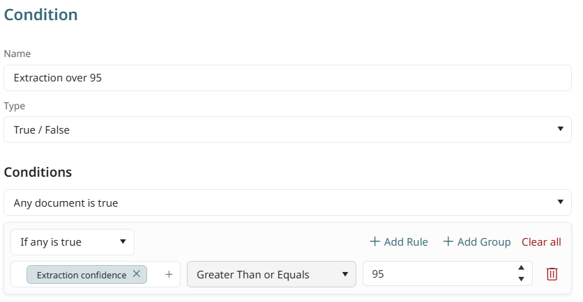 You could create a condition that examines the Extraction confidence. If the confidence percentage exceeds 95%, you may want to skip a Validation step in the process flow. In this case, you need a condition that is the Type true/false and sets "All documents are true" for Extraction confidence to Greater Than or Equals 95.