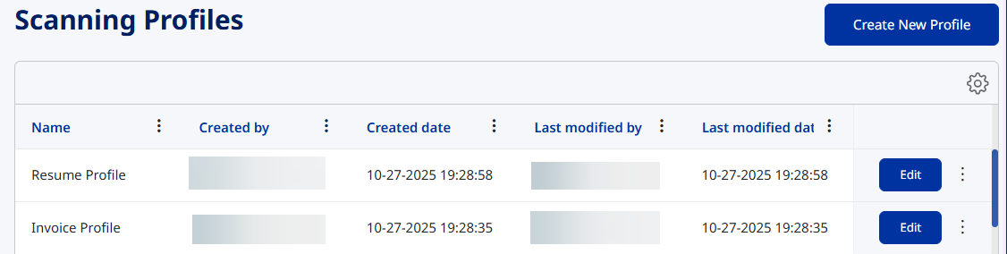 Once saved, the profile is listed in the Scanning Profiles screen. You can filter this list based on the following columns: Name, Created by, Created date, Last modified by and Last Modified date. Use the Edit option to make changes to a profile as needed. Any changes are reflected in the Last Modified by column.