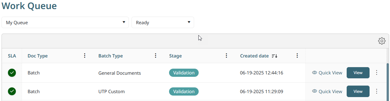 Last Updated: Version R2510If a Validation task is a required step in the batch process flow, the task appears in the Work Queue. Note that only users who have been assigned can complete this Validation stage. To complete the Validation stage, click View.