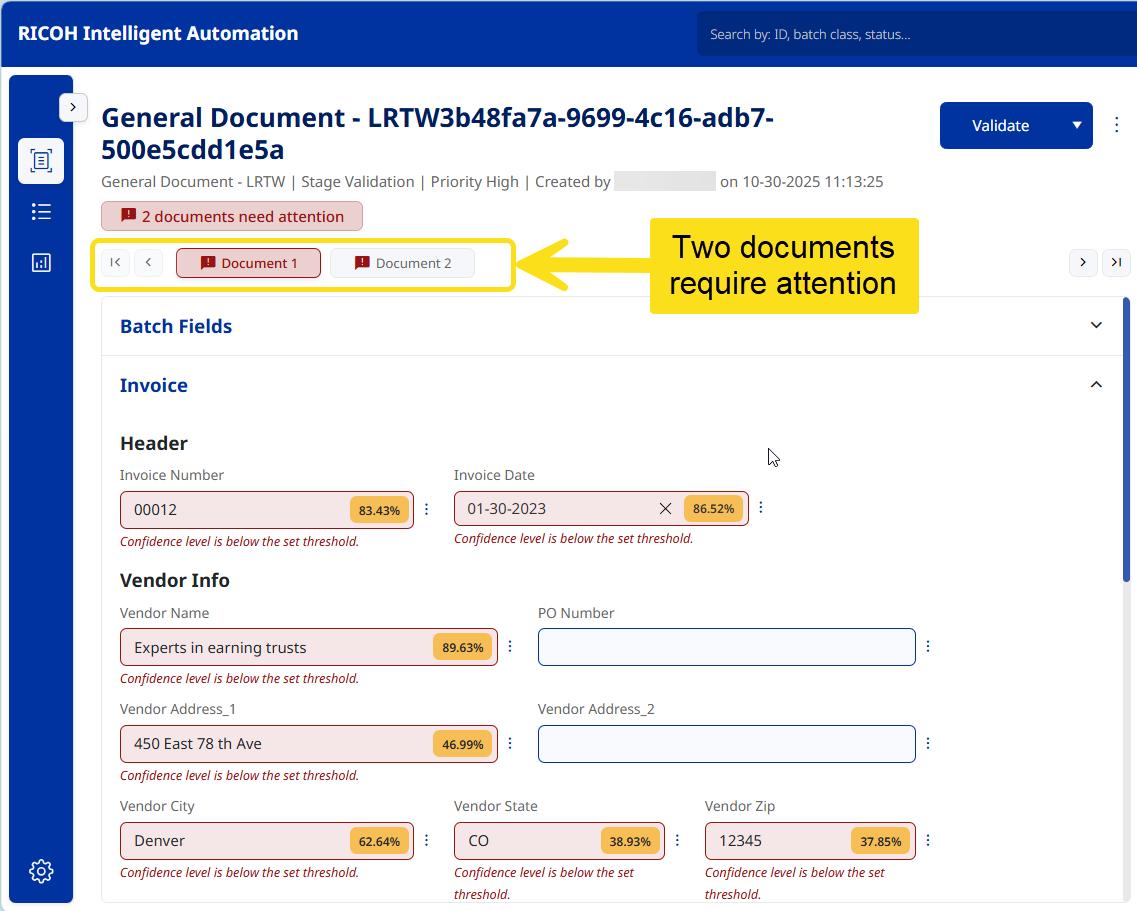 Depending if AI extraction was a required part of the process flow, the Validation screen may list the confidence percentage thresholds for required fields. In the example below, there are 2 documents that need field level validation. For Document 1, shown below, you can see that the confidence threshold for many fields have thrown a flag because the confidence level does not meet the thresholds. To correct these fields: