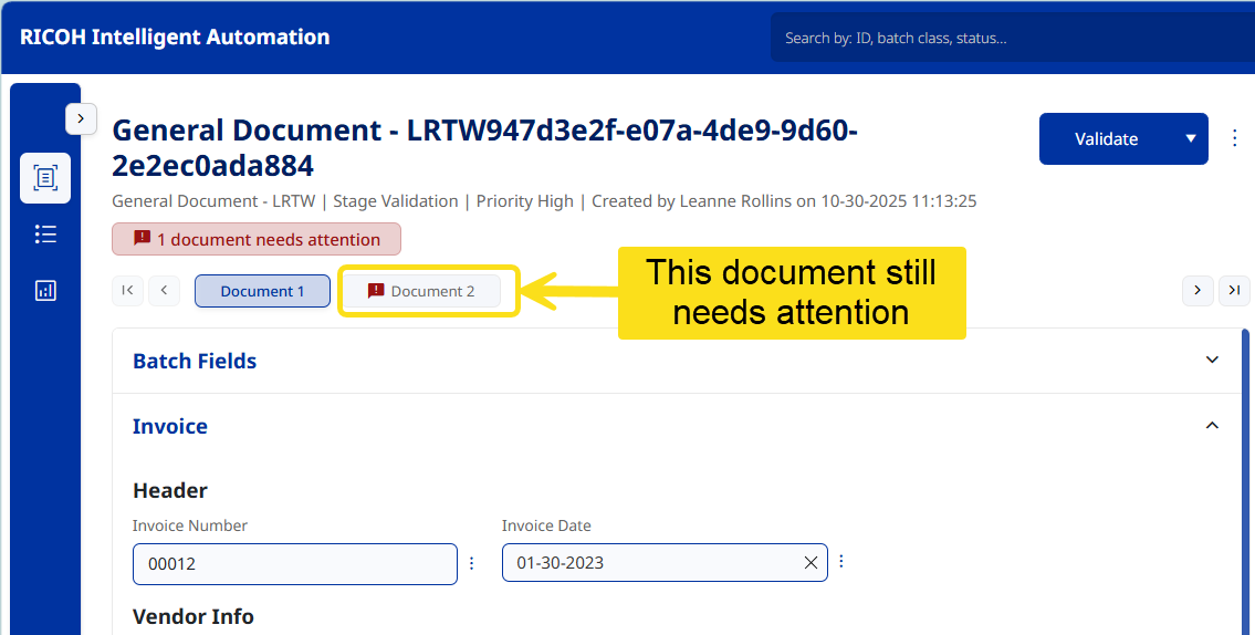 In the example below, the data is not showing any AI confidence threshold errors on Document 1. Instead, the Operator would verify the fields on Document 1, and then proceed to validate fields on Document 2.