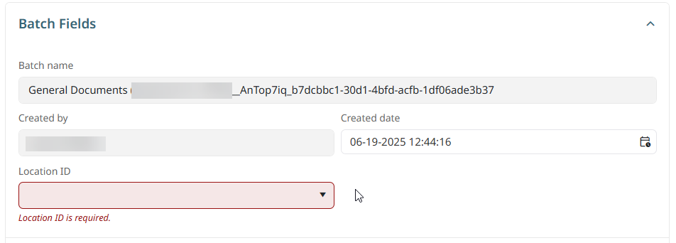 Depending on the settings for this batch process flow, you may need to complete specified batch fields. In this example, the Operator must select a Location ID before the batch can be submitted.
