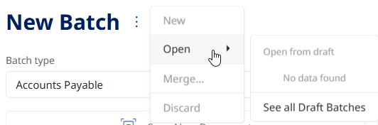 From the New Batch screen, you can either start a new batch or edit any draft batches that you saved but did not submit. As shown in the screen capture below, to see your draft batches you can click the Ellipses button beside New Batch, and choose Open, and then Open from draft or See all Draft Batch from the menu.