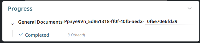As the documents are processed, a progress indicator appears in the bottom right corner. As each document is complete, the status is updated to 'Completed'. You can click on a completed document to preview it on the screen and complete and verify the batch fields.