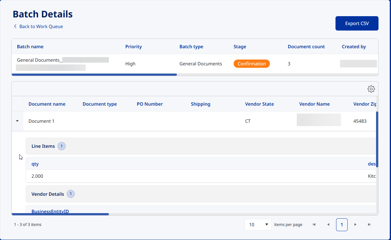 This screen lists the batch name, priority setting, all batch fields and other batch details. You can click the down arrow located beside each document in the batch to view full document details.