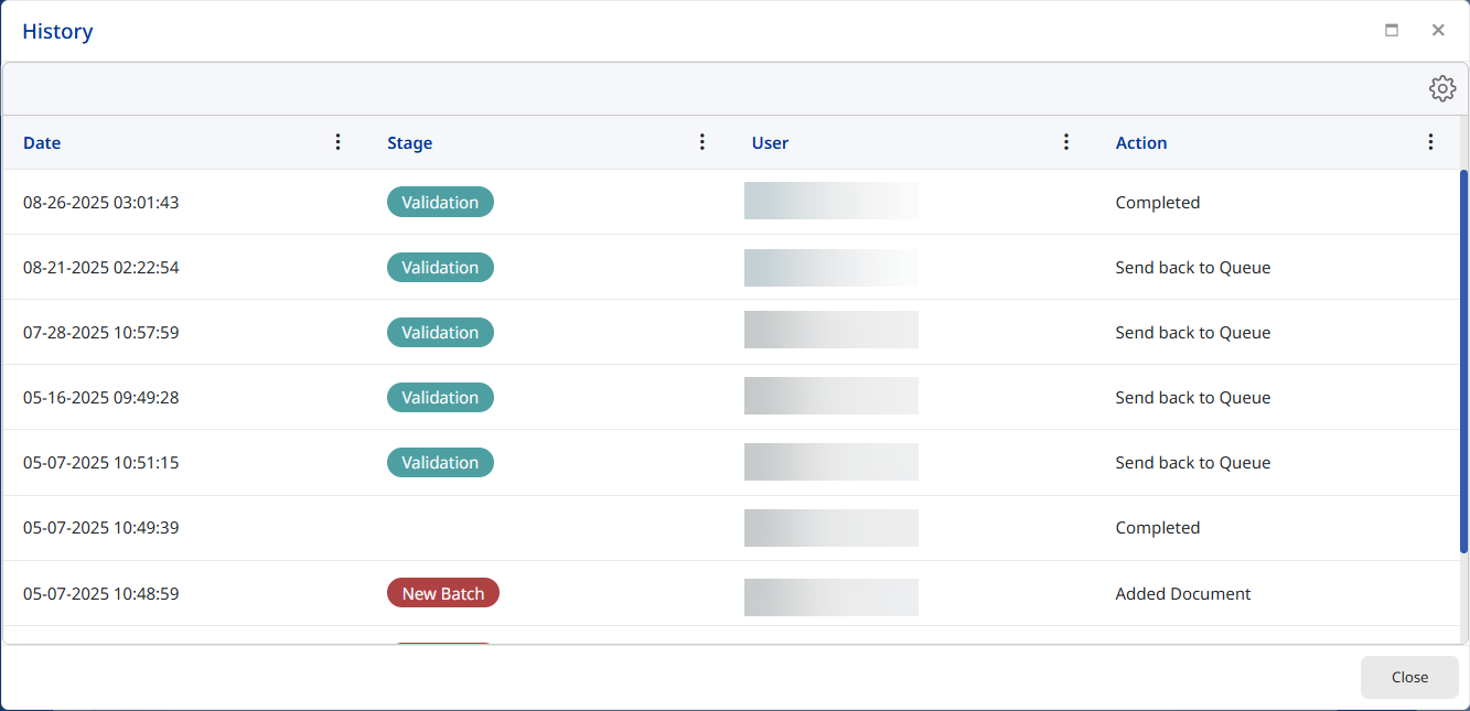 The batch history provides the date, stage, User responsible, and the action taken for the selected batch.
