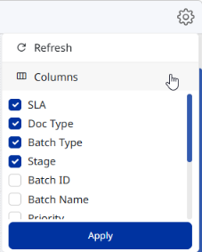 The Gear button is available to customize the columns that appear in the Work Queue. Click the Gear button, and then select Columns. Those columns that are currently displayed in the queue are checked. Select or Deselect as many columns as necessary.