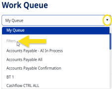 After a batch is submitted, it is added to the Work Queue. The appearance of the Work Queue depends on if the Designer has created a Work Queue Filter and assigned to your User ID (or to a User Group your are part of). Drop-down the Work Queue list to view any created filters. These filters alter the contents of the Work Queue based on the Batch type, stage, SLA status and priority set by the Designer. The columns that appear in the queue are also pre-defined. However, if you select My Queue, the Work Queue will contain ALL batch types that you are assigned to, regardless of filters.