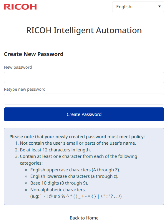 RICOH IA's password policy is indicated in both the invitation email and on the screen itself.