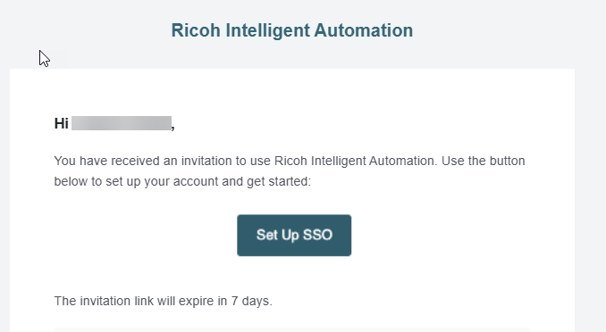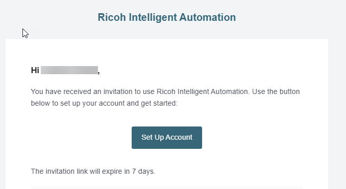 Last Updated: Version R2510To obtain an account, you must provide a valid email address to an Administrator. The Administrator will add the account, and you will receive an email notification. Look for an email invitation with the Sender 'Ricoh Document Intelligent', and click the Set Up Account button that appears in the email message.